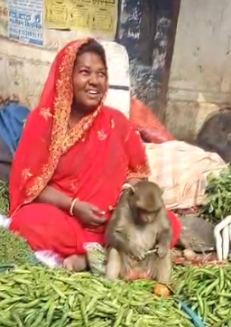 सब्ज़ी विक्रेता के गोद में बैठा बंदर, चर्चा जोरो पर